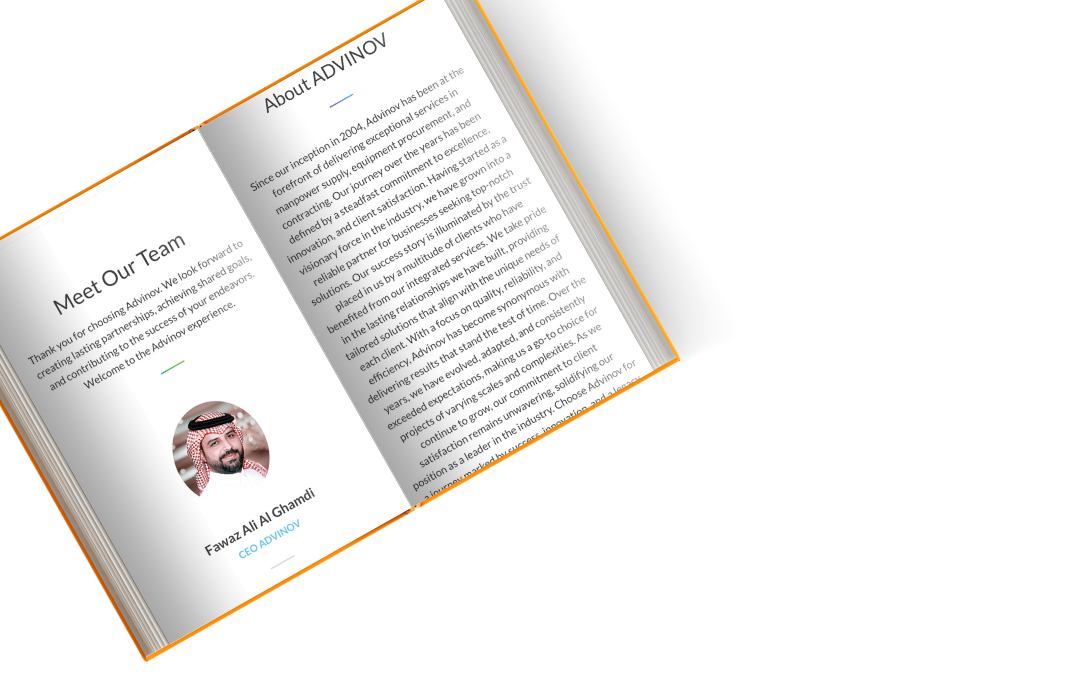 Since our establishment in 2014, Advinov has emerged as a leading provider of integrated solutions across manpower supply, equipment procurement, and contracting services. Our journey is marked by innovation, reliability, and client-centric values, showcasing our unwavering commitment to excellence in every project.
